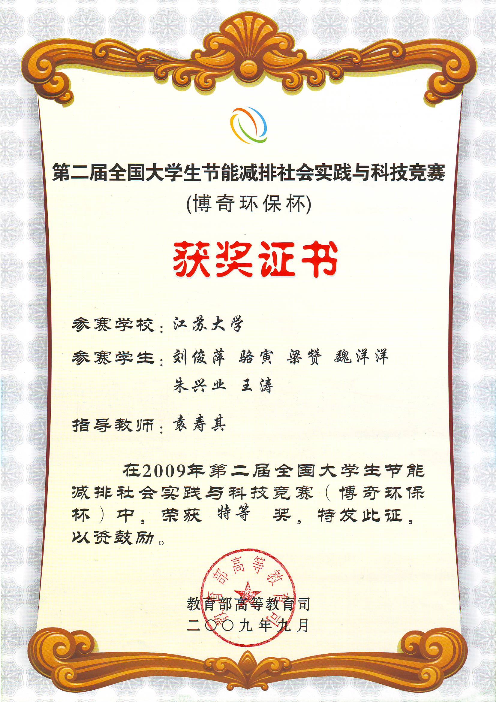 第二節全國大學生節能減排社會實踐與科技作品競賽特等獎